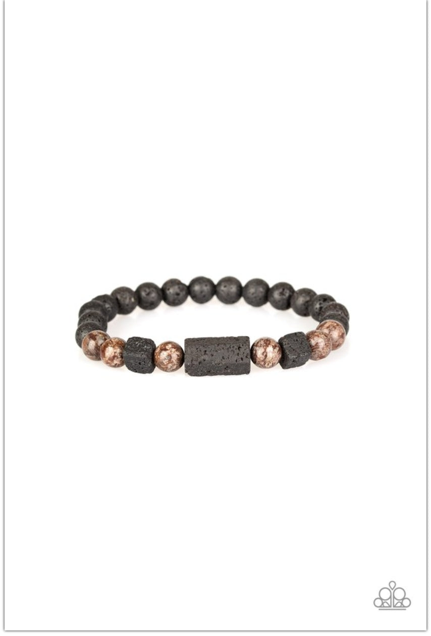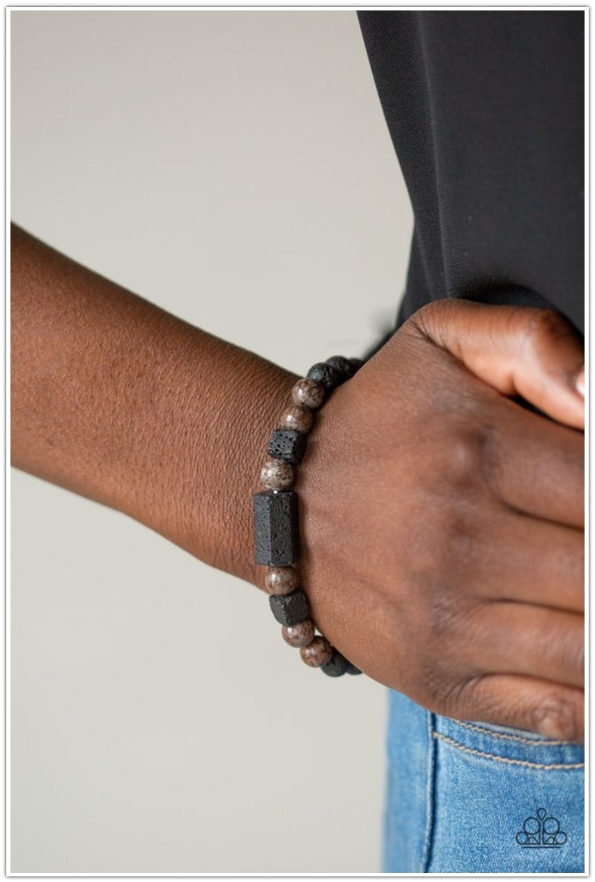 A collection of earthy black lava rock and tranquil brown stone beads are threaded along a stretchy band around the wrist. Cubed and pentagon-shaped black lava rock accents adorn the center for a seasonal finish.