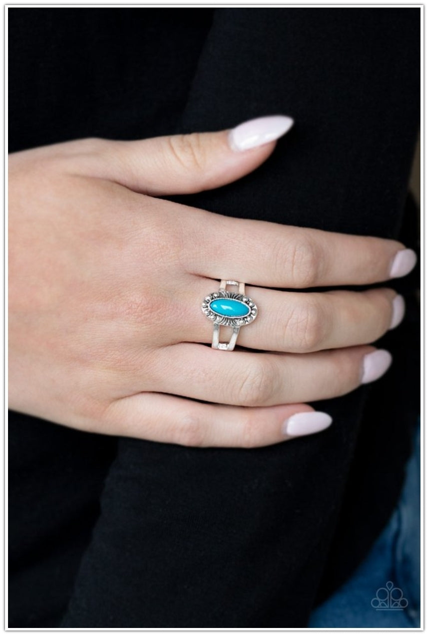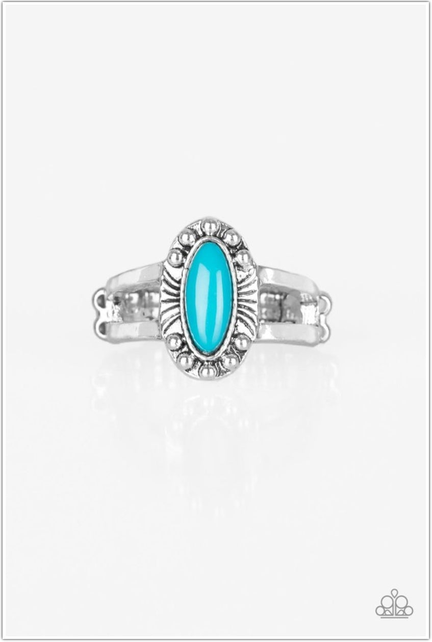 Featuring an edgy marquise shape, a refreshing blue bead is pressed into a dainty silver frame radiating with studded and wispy linear patterns for a colorful tribal look. Features a dainty stretchy band for a flexible fit.