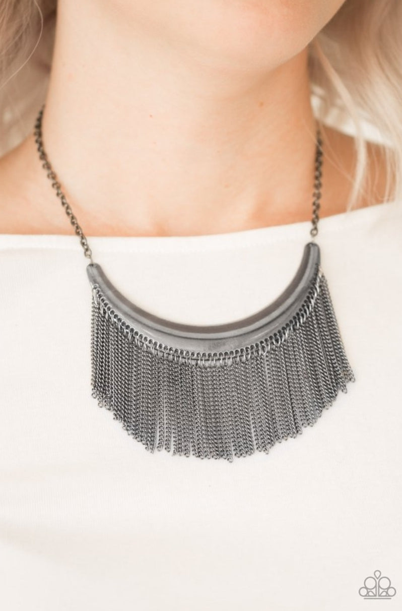 Brushed in an antiqued finish, glistening gunmetal chains stream from the bottom of a gunmetal crescent, creating a bold fringe below the collar for a fierce look. Features an adjustable clasp closure.